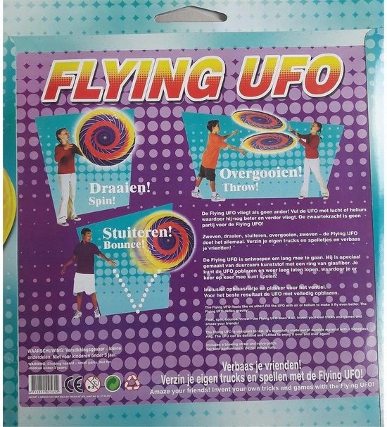 Zweven, draaien, stuiteren, overgooien, de Flying Ufo doet het allemaal. Verzin je eigen trucks en spelletjes en verbaas je vrienden! De Flying Ufo is ontworpen om lang mee te gaan. Hij si speciaal gemaakt van duurzaam kunststof met een ring van glasfiber. Je kunt de Ufo opblazen en weer leeg laten lopen, waardoor je er keer op keer mee kunt spelen! Met opblaasrietje en plakker voor het ventiel. Doorsnede ca. 1 meter!