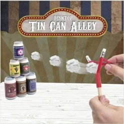 Bureaublad Tin Can Alley. Hoeveel blikken kun jij met je Cata-potlood omgooien? Een potlood met een gespleten uiteinde (met dubbele gum) nieuwigheidskatapult! Breng het plezier terug naar het werk of naar school – gooi de gummetjes in de vorm van een blikje weg nadat je een van de vellen papier uit het in de verpakking meegeleverde notitieblok hebt gebruikt! Entertain uw vrienden en collega’s of oefen gewoon uw doel in uw pauze! In elk pakket krijg je Catapencil, 5 blikjes, Gummen, Notepad