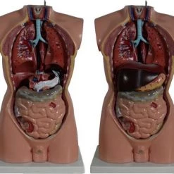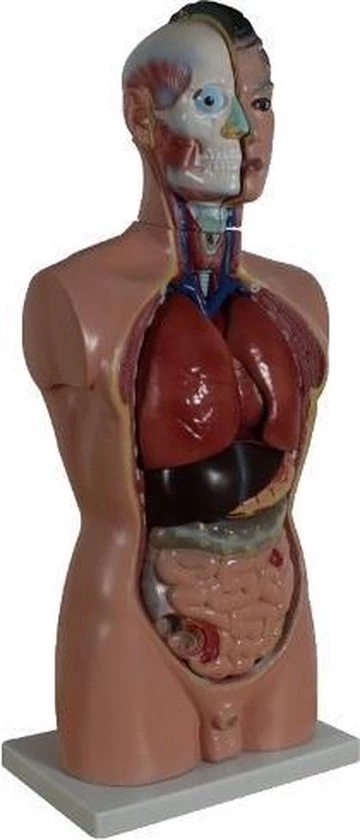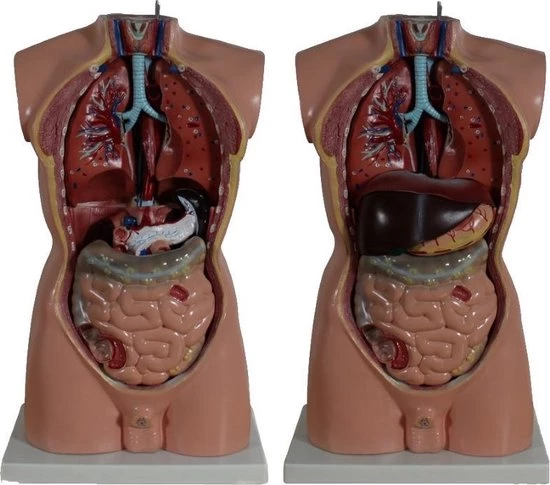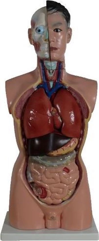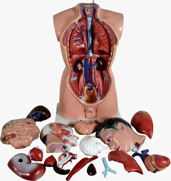 Dit menselijk romp bestaat uit 19 delen: – Hoofd (2x) – Hersenen – Long (4x) – Hart – luchtpijp – slokdarm – aorta – blaas (2x) – maag – lever – nieren – milt – Alvleesklier – Darmen. Aantal individuele stukken19 delig en de hoogte van het menselijke lichaam is 85 cm