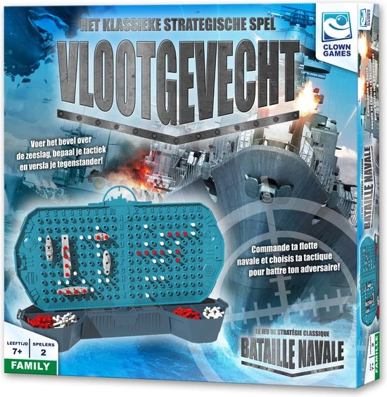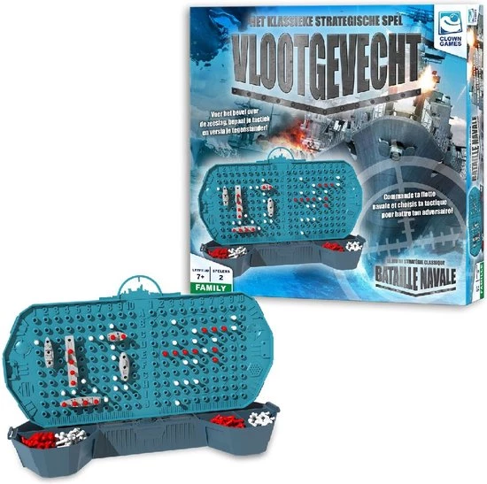 Zoek, schiet en win dit Clown Vlootgevecht spel! Kun jij de vloot van je tegenstander tot zinken brengen voordat al jouw schepen naar de haaien zijn? Beide spelers verdelen hun schepen op hun oceaanraster. Het verticale doelwitraster zorgt dat je elkaars schepen niet kunt zien! Blijf vuren en markeer je treffers met de rode pinnetjes. Gebruik de witte pinnetjes om bij te houden waar je miste, zodat je geen schoten verspilt. Als je logisch denkt en af en toe wat risico neemt, breng je de vijandelijke schepen tot zinken. Doe dit snel, want de vijand probeert hetzelfde met jouw vloot te doen! Plan je strategie en leid je troepen naar de overwinning! Inhoud: 2 spelconsoles met opruimmogelijkheid voor de pinnen, 2 sets oorlogsschepen, 1 set rode pinnen en een set witte pinnen. Inclusief spelinstructies. Geschikt voor twee spelers vanaf 7 jaar.