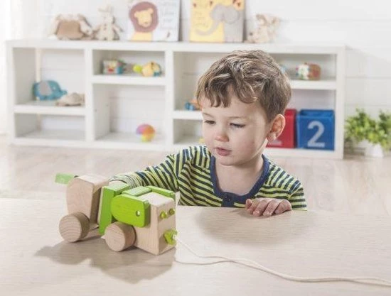 Met deze vrolijke hond van hout kan jouw kind op wandel avontuur!