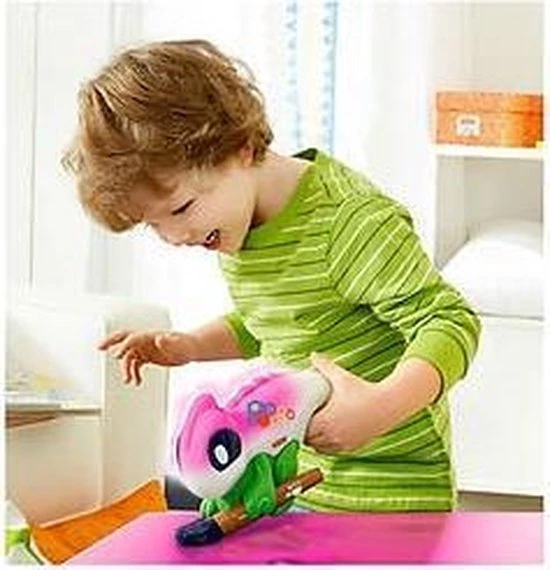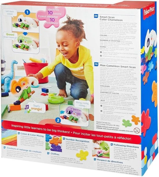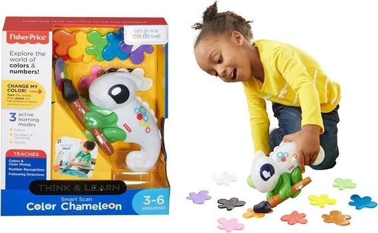 Ontdek de wereld van kleuren en cijfers met deze smart scan kleurenkameleon van Fisher Price. Laat de kameleon de kleuren scannen en zie hoe de kameleon van kleur verandert en hoor hoe hij deze kleur benoemt. Leg de bijgeleverde verfspatten uit en leer tot 10 tellen door met de kameleon eroverheen te bewegen. De Fisher Price kleurenkameleon is gemaakt van stevig kunststof. Spelen met de kameleon zorgt met zijn opdrachten voor actie en educatief speelplezier! Inclusief batterijen.