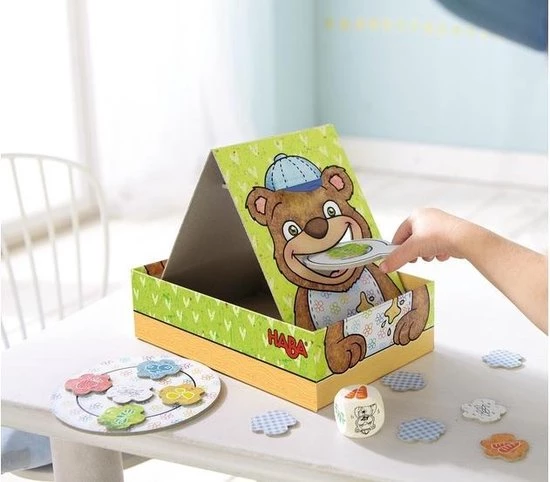 De beer heeft reuzenhonger. Gelukkig staat er al een bord met verschillende lekkere hapjes klaar. Maar welke hapjes mag de kleine beer eerst eten? Dat verklapt de dobbelsteen. Wie helpt mee om de kleine beer te voeren?