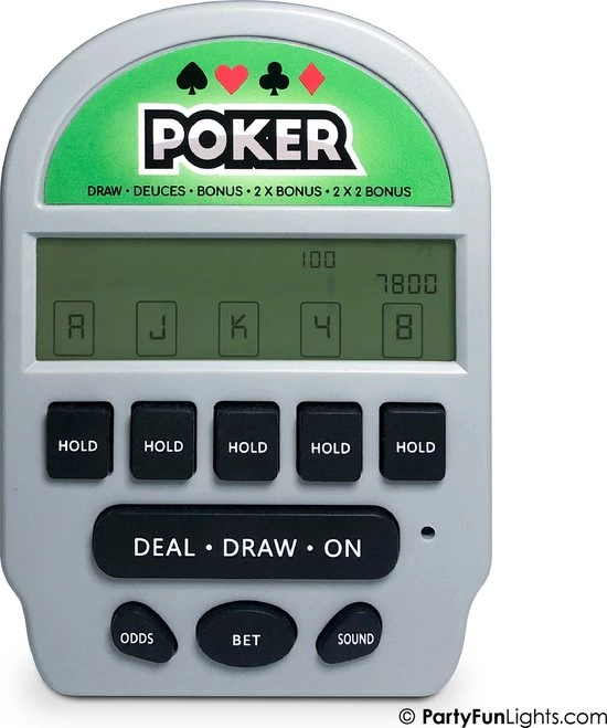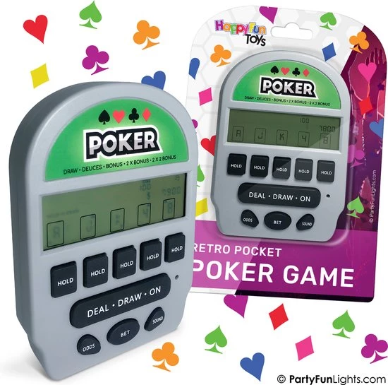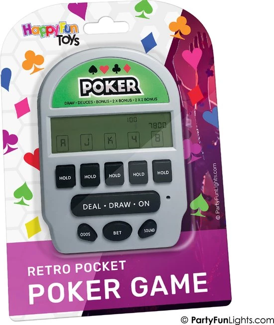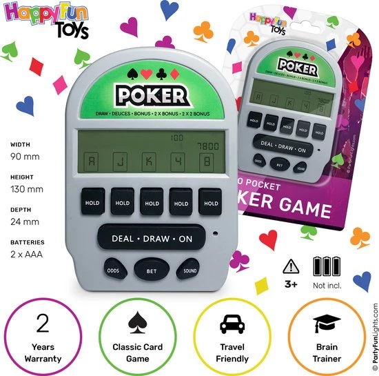 Een leuke elektronische versie van het klassieke kaartspel Poker! Het gemakkelijk te lezen scherm en de gebruiksvriendelijke lay-out zorgen voor een snelle start. Deze elektronische computer in handformaat zorgt ongetwijfeld voor veel vermaak en houdt je geest scherp en geconcentreerd. Voor je het weet ben je een pro! 2x AAA Batterijen (niet meegeleverd)