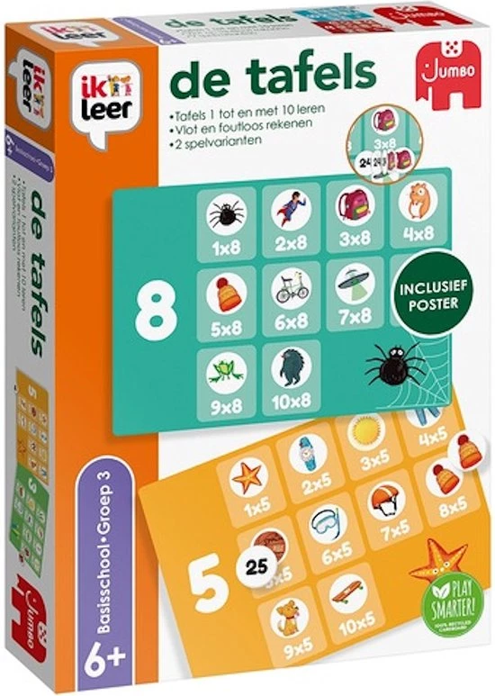 Leer met behulp van 2 spelletjes en de poster de tafels van 1 tot en met 10. Weet jij de antwoorden op de sommen? Zoek de juiste getal-fiches en leg ze op de kaart. Controleer je uitkomst door het fiche om te draaien. Komt het plaatje overeen? Dan is het antwoord goed!