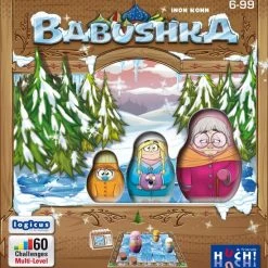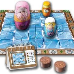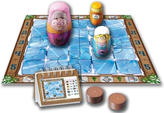 Het is steenkoud. Grootmoeder en haar twee kleindochters glibberen over het spiegelgladde ijs. Lukt het je om ze allemaal op dezelfde plek bij elkaar te brengen? Je moet 2 of 3 matrushka poppen over het speelbord verschuiven en in elkaar zetten. Dat is nog niet zo gemakkelijk als je geen houvast hebt..