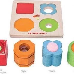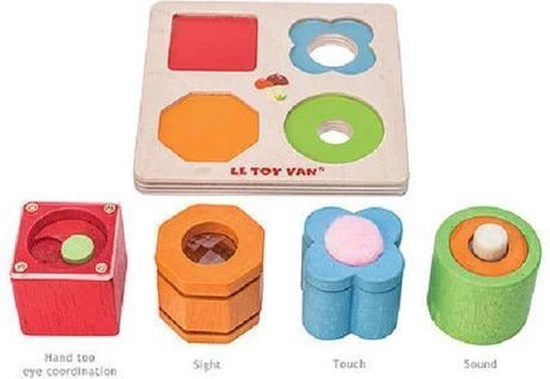 Een leuk zintuiglijk speeltje met 4 stukjes om verschillende zintuigen en vaardigheden te stimuleren: zicht, geluid, aanraking en behendigheid. Elk stuk is gemaakt met massief rubberhout en op water gebaseerde kleuren, om te sorteren in de bijpassende lade. Vorm- en kleurherkenning ontwikkelen logisch denken. Ontdek ze allemaal met dit multi-sensorisch speelgoed.