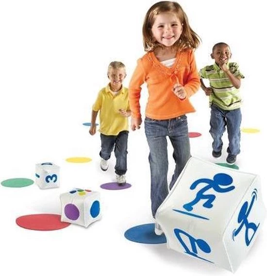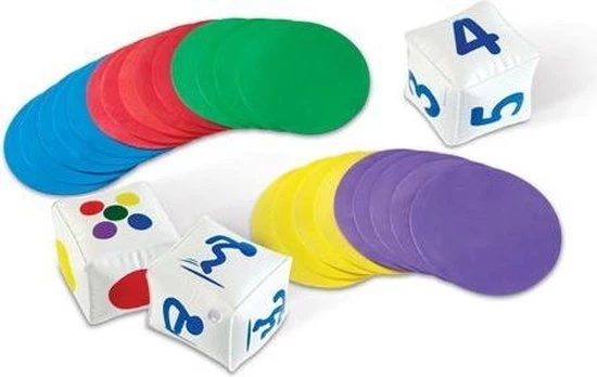 D? basisset om bewegend leren (en leren bewegen) te introduceren in de klas of groep! Deze Klaar voor de start activiteitenset bestaat uit vijf zachte, ronde matten (25 cm.) in verschillende kleuren en drie opblaasbare dobbelstenen (12 x 12 x 12 cm.) met oefeningen, kleuren en getallen. De kinderen (maar ouderen kunnen dit spel natuurlijk net zo goed spelen) staan op ??n van de gekleurde matten. Rol de dobbelsteen met de bewegingen om te bepalen welke activiteit uitgevoerd moet worden. Rol de dobbelsteen met de getallen om te bepalen hoe vaak de beweging moet worden gedaan. Krijg iedereen spelenderwijs in beweging!