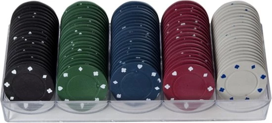 Longfield Games pokerfiches, 100 stuks in de kleuren zwart, groen, blauw, rood en wit.