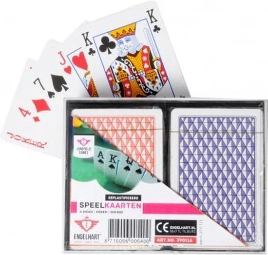 Longfield Games speelkaarten De speelkaarten zijn geplastificeerd en worden geleverd in een etui van kunststof. Specificaties: Kleur: multicolor Geslacht: junior/unisex Materiaal: karton Aantal: 2 stuks