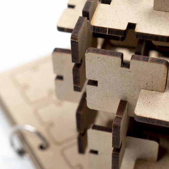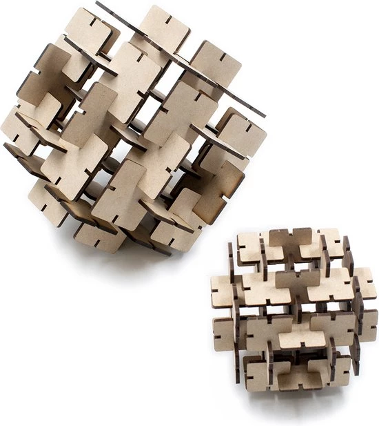 De 3D houten puzzel bestaat uit maar liefst 66 identieke stukjes en is modulair opgebouwd. Het puzzeltje wordt geleverd in een compact houten doosje dat door je brievenbus past, je hoeft er dus niet voor thuis te blijven!