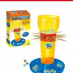 Laat de knikkers niet vallen! Elke speler moet om de beurt een stokje uit de buis trekken zonder dat er een knikker valt. Wie het minst knikkers in zijn vakje heeft, heeft gewonnen!