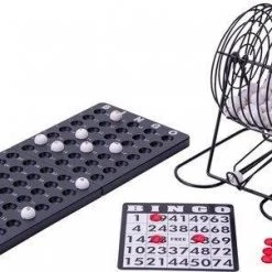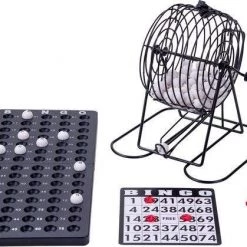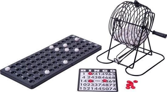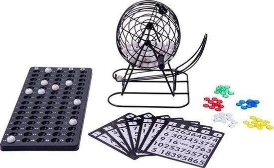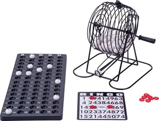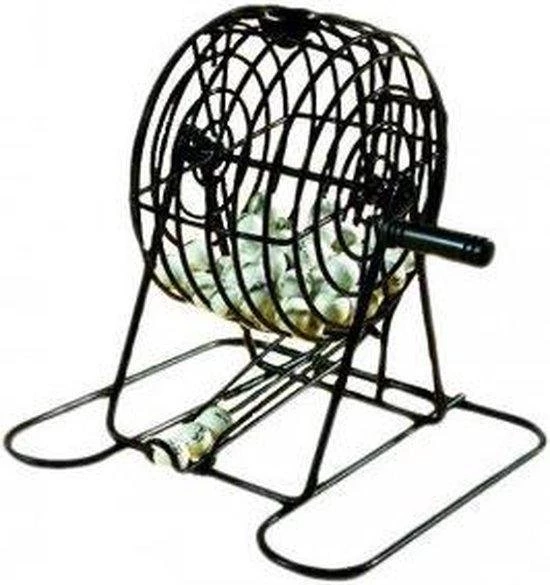 zwarte molen met een doorsnede van 13,5 cm. Inclusief kunststof controlebord, met 75 kunststof balletjes. Met bingokaarten en gekleurde fiches.