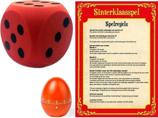 Sinterklaasspel met rode dobbelsteen en timer/wekker. Onmisbaar tijdens pakjesavond zodra de kinderen niet meer geloven in Sinterklaas en zijn Pieten: het Sinterklaasspel/pakjesspel. In deze start set ontvangt u: 1x Sinterklaasspel spelregels, 1x rode foam dobbelsteen en 1x oranje kookwekker/timer.