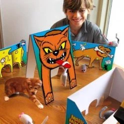 Van piepjong tot grijze muis, iedereen doet mee! Super simpele spelregels, dus je kan meteen spelen. Richt de muis met z’n neus op een Puntenpoort. Trek ‘m naar achteren en als je hem loslaat… gaat hij rennen! Rent de muis door een Puntenpoort, dan win je de punten die erboven staan. En als de muis eerst ook tussen de poten van de Grijpkat door sprint, dan krijg je dubbele punten!