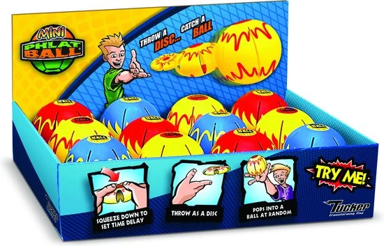Gooi een disk en vang een bal! Druk de onder- en bovenkant stevig tegen elkaar en je Phlat Ball is plat! De Phlat Ball springt vanzelf open tot een bal! Wil je je Phlat Ball meenemen? Druk hem plat en hij past in je tas!