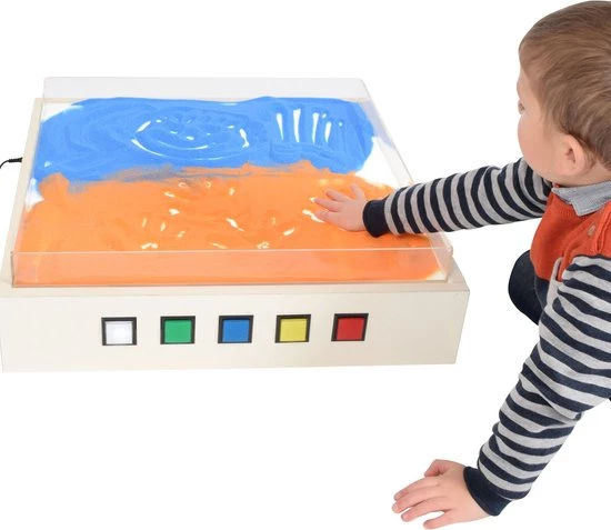 Deze lichttafel is gemaakt voor zand en rommelig spelen met behulp van een acryl-inzet. De lichttafel is een houten constructiedoos van top- of vloerkwaliteit speeltafel met zes van kleur veranderende grote knoppen voor kleurselectie, ideaal voor zintuiglijk spel en observatie. Het tafelblad van acryl helpt om het zand en de rommel onder controle te houden en zorgt voor intu?tief en zintuiglijk spel om lichtkunst te maken met een grote verscheidenheid aan materialen.