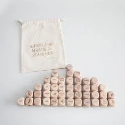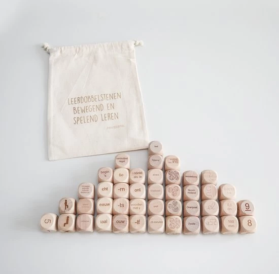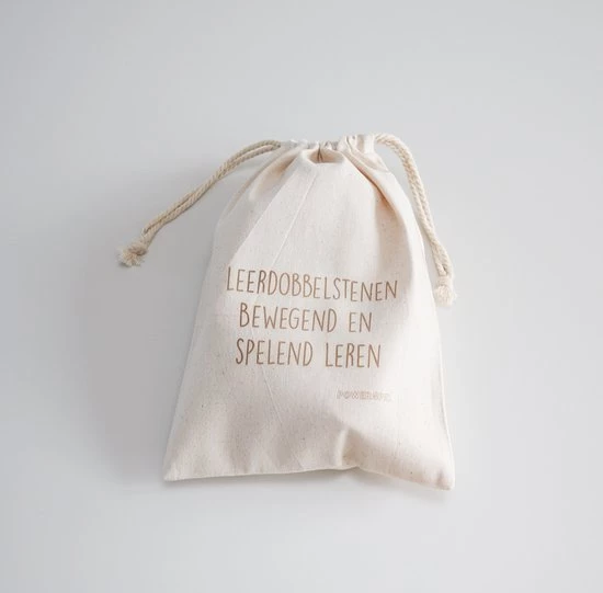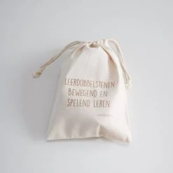 De 43 dobbelstenen zitten in een katoenen zak van ongeveer 20 x 30 cm, zodat ze handig op te bergen zijn.
