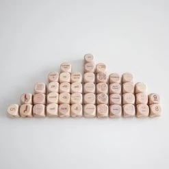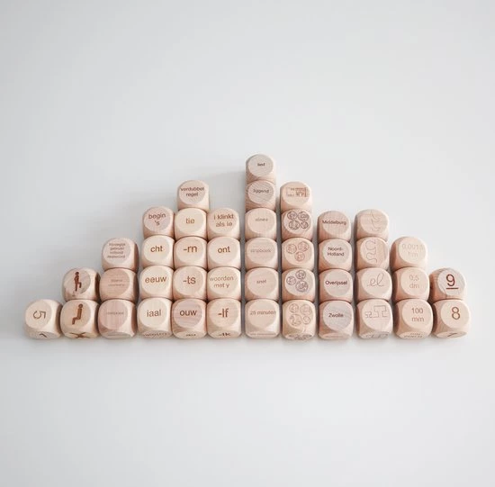 Deze voordeelset van 43 dobbelstenen voor spelend en bewegend leren, bestaat uit houten dobbelstenen van 3 cm, verdeeld over meerdere vakgebieden;
