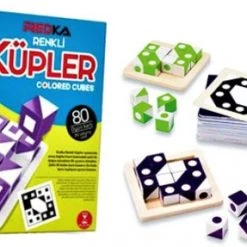Gekleurde kubussen worden gespeeld met de kaarten en kubussen die in de doos zitten. Er staan ??verschillende afbeeldingen op de kaarten.