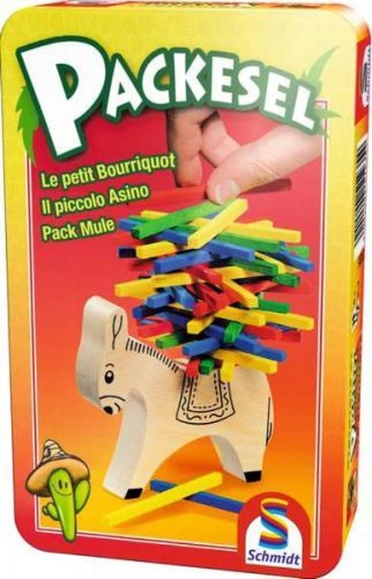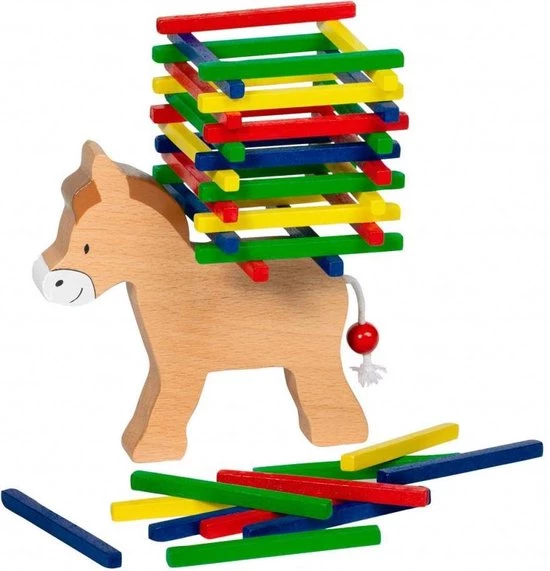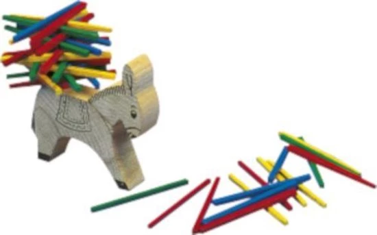Lukt het om alle stokjes op de rug van de ezel te leggen zonder dat ze eraf vallen? Wie dat als eerste met succes doet, is de winnaar. Het houten speelmateriaal en het stevige blik maken het spel daarnaast een lust voor het oog!