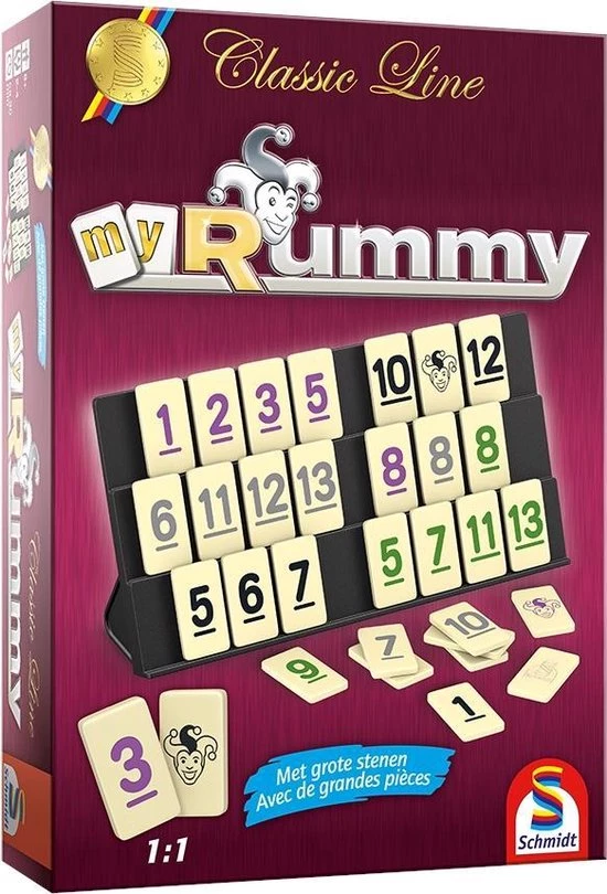 Kartonnen doos. Rummy is een variant van het bekende Rommikub©, dat vooral in de Verenigde Staten veel wordt gespeeld. De aantrekkelijkheid van het spel ligt in de verschillende combinatiemogelijkheden. Op de stenen van Rummy staan getallen i.p.v. de bekende symbolen van het spel met stenen.