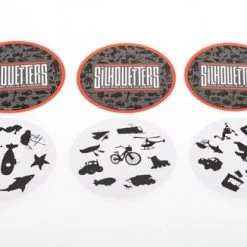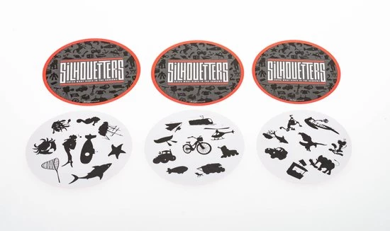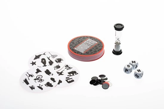 Gooi de dobbelstenen, draai 2 kaarten om en draai de zandloper op. Roep of noteer zo veel mogelijk woorden die gelinkt zijn aan een silhouet. De beginletter van dit woord moet overeenkomen met één van de geworpen dobbelstenen.