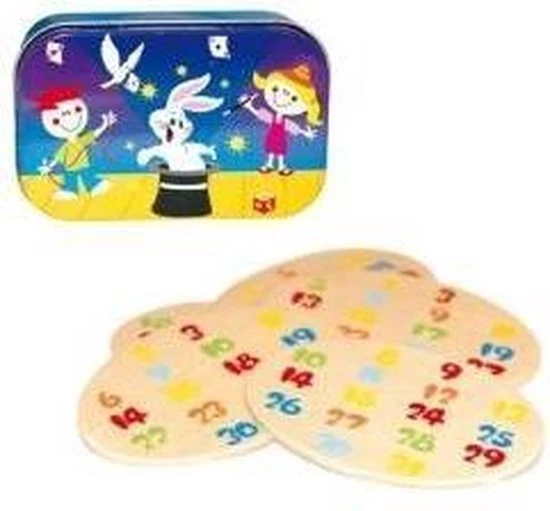 Goochelen met cijfers: Neem een getal van een van de houten plankjes in je gedachten en ik zal je vertellen welk getal dat is!! Afmeting van het blikje LxBxH 10 x 6,5 x 3 cm.