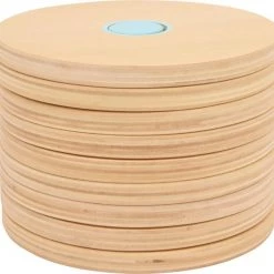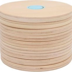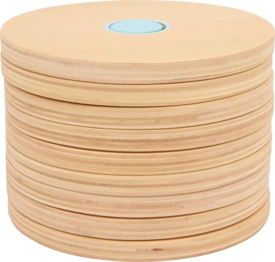 8 stevige schijven (1 cm dik) van fijn geslepen multiplex moeten op de kleurige stokjes worden gestoken. Omdat de stokjes een verschillende lengte hebben en iedere schijf altijd een opening minder heeft dan de voorafgaande, is er voor de oplossing maar ??n weg!