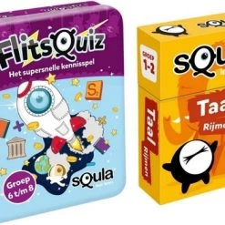 Flitsquiz voor groep 6 t/m 8! Test je kennis in dit flitsende kaartspel! Geef jij als snelste het juiste antwoord? Het spel bestaat uit meer dan 100 uitdagende vragen over verschillende basisschoolvakken. Draai een kaart open op tafel en bedenk het goede antwoord. Weet jij het juiste antwoord? Wees dan snel, voor je het weet is iemand je voor! Degene met de meeste punten wint. Soeel snel en slim. Klaar voor de start?… Flits! Veel speelplezier!