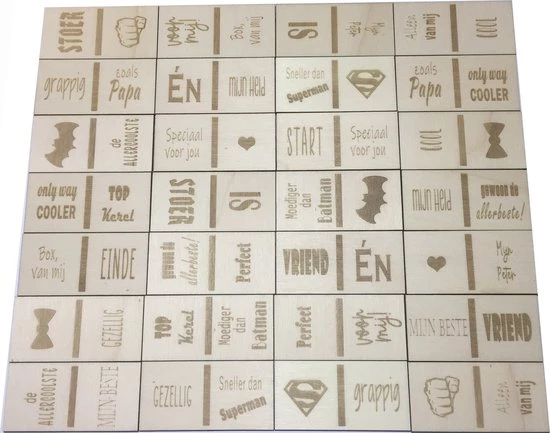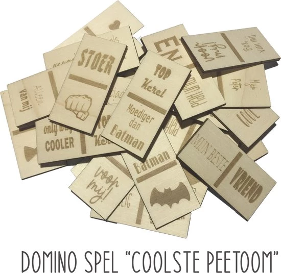 Wil je een origineel cadeau geven aan je Peetoom? Geef eens een domino spel cadeau.(afmetingen steentje 7×3,5cm) 28 stuksVerpakt in een doosje met tekst: Voor de coolste Peetoom. (afmetingen doosje 17x8x2cm)