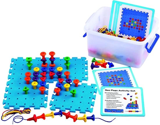 Ideal for developing fine motor skills, patterning & sequencing, creative design, addition & subtraction and logical reasoning skills. Contains: 4 EVA foam boards that can be joined together, 144 pegs in 6 colours, 12 laces, 12 double-sided activity cards supplied in a sturdy plastic container.