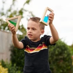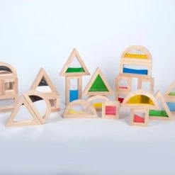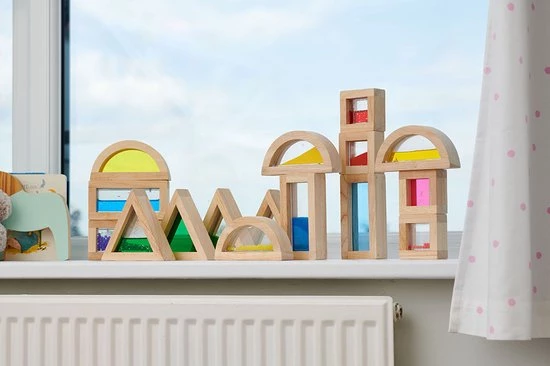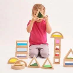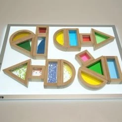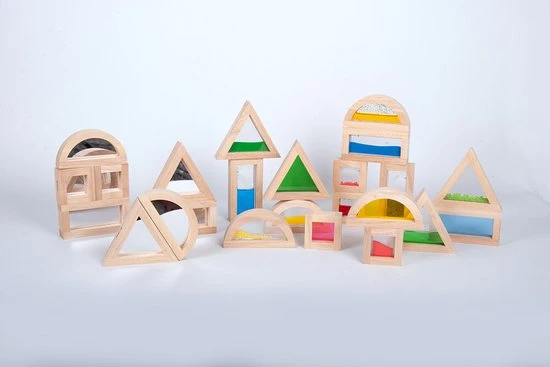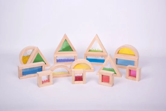 16 grote rubberhouten blokken met kralen, transparant acryl, gekleurd zand en met water/glitter gevulde vakken in 4 verschillende vormen (vierkant, rechthoek, driehoek en halve cirkel). De sensorische blokken zullen observatie in bredere zin bevorderen, aangezien alle vormen dezelfde conventie van kleur en vorm volgen. Dus bijvoorbeeld, ongeacht de inhoud van het blok zijn de driehoeken altijd groen. De combinatie van de gladde houten buitenkant en het felgekleurde sensorische centrum maakt een fascinerend onderdeel met een veelvoud aan educatieve mogelijkheden voor gebruik met kinderen van alle leeftijden.