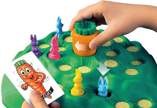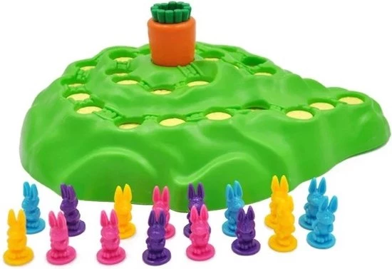 Het Konijnenrace gezelschapsspel is eenvoudig in elkaar te zetten en heeft eenvoudige regels. Het doel van het familiespel is om met je konijn de top van de heuvel te bereiken.