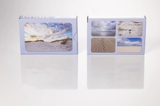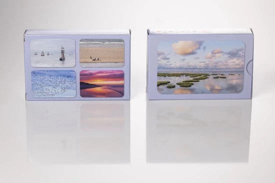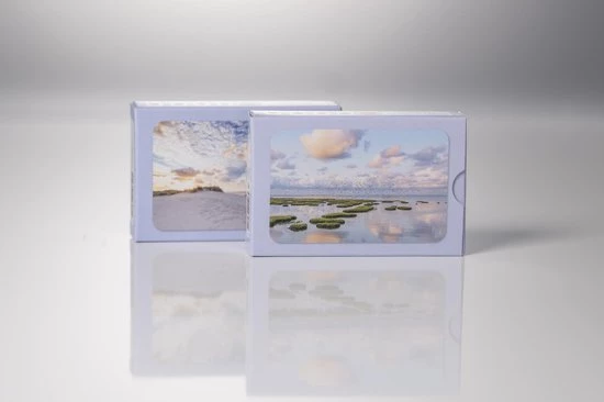 Bridge Speelkaarten, rood en blauw met fotografie van de Waddeneilanden. Ieder kaart in het spel heeft een uniek ontwerp met een aparte foto van de prachtige Waddeneilanden. De heer, vrouw, boer en aas zijn ook aangepast voor de Wadden. Heel leuk cadeau voor mensen die houden van de natuur, fotografie of de eilanden.
