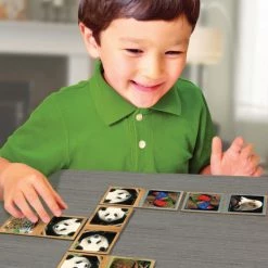 Speel domino met mooie grote tegels van FSC hout met daarop schitterende foto’s van de indrukwekkende Amerikaanse zeearend, de schattige reuzenpanda, de stoere amoerpanter, de vrolijke tuimelaar (dolfijn), de kleurrijke regenbooglori (papagaai-achtige) en de bruine anamoonvis (ook bekend als de clownvis uit Finding Nemo).